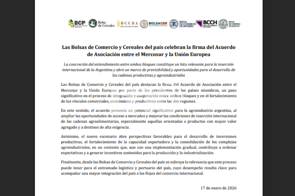 Desde el sector institucional, las bolsas de comercio y de cereales del país expresaron su respaldo al acuerdo y señalaron que su concreción “constituye un hito relevante para la inserción internacional de la Argentina”. Además, indicaron que la firma “abre un marco de previsibilidad y oportunidades para el desarrollo de las cadenas productivas y agroindustriales”.
