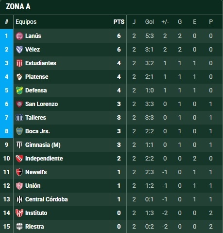 En lo más alto del grupo aparecen Lanús y Vélez, ambos con puntaje ideal tras ganar sus dos compromisos, confirmando un inicio sólido que los posiciona como protagonistas tempranos. En el otro extremo de la tabla se encuentra Riestra, que todavía no pudo sumar y ocupa el fondo de la zona luego de caer en sus dos presentaciones.