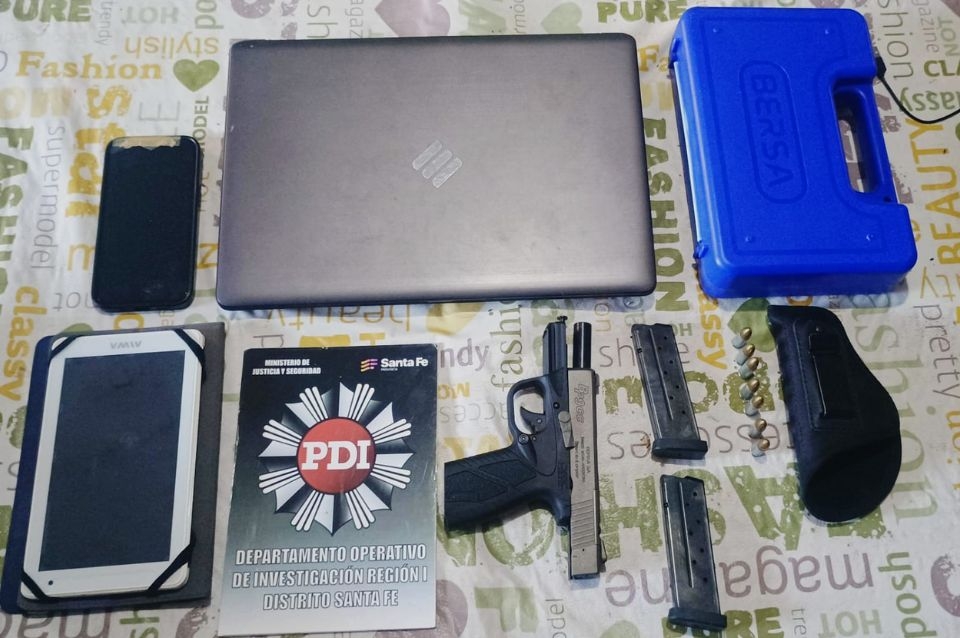 Bajo las órdenes del juez Luis Octavio Silva, el personal de la PDI registró fincas ubicadas en calle J.P. López al 4400, Pasaje Cardona al 4100 y Pasaje Braile al 1900. Lo hallado en los domicilios escaló la gravedad de la causa, ya que se encontró armamento y elementos vinculados a las fuerzas de seguridad: una pistola Bersa calibre 9mm con dos cargadores y 158 cartuchos intactos; un chaleco refractario con la inscripción "Policía", una pistolera interna y cajas de armamento; y tres teléfonos celulares, una tablet y una notebook que serán peritadas para buscar pruebas de las maniobras extorsivas.