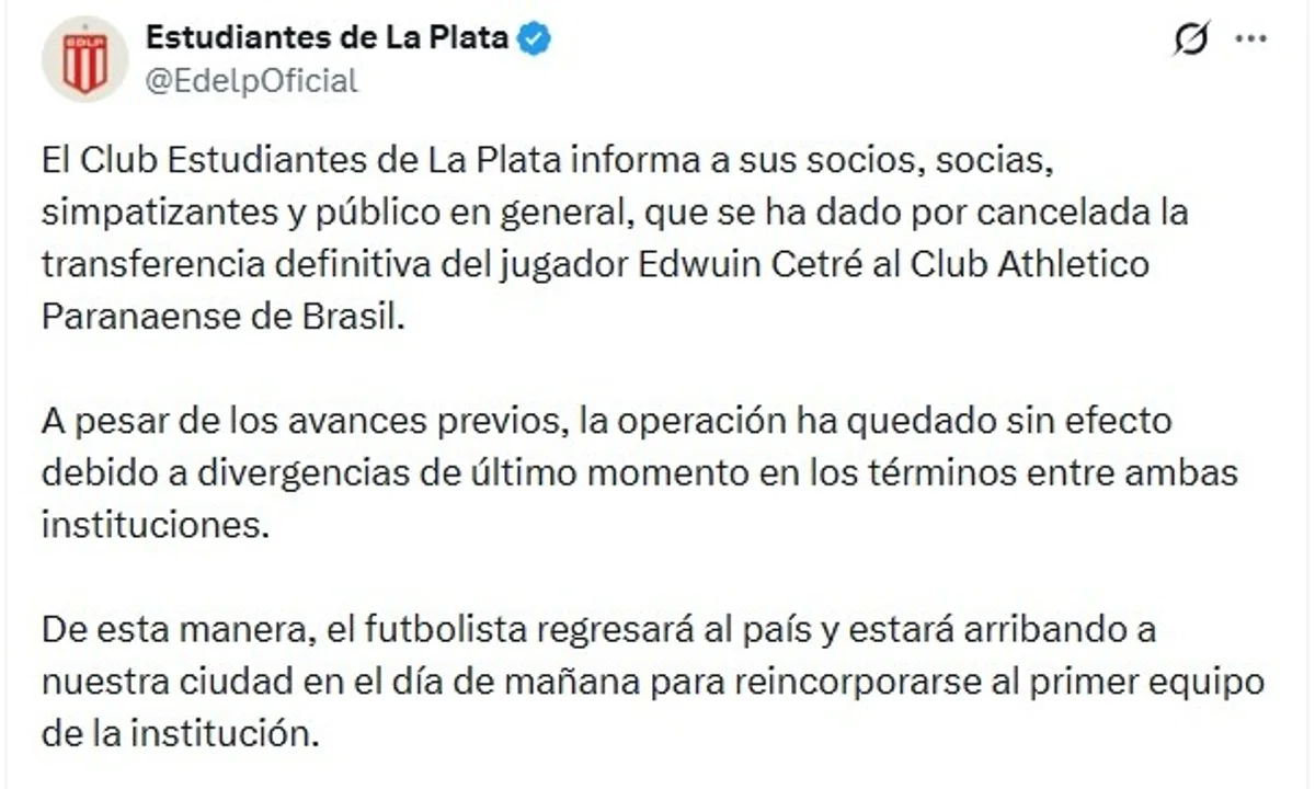 “A pesar de los avances previos, la operación ha quedado sin efecto debido a divergencias de último momento en los términos entre ambas instituciones. De esta manera, el futbolista regresará al país y estará arribando a nuestra ciudad este lunes para reincorporarse al primer equipo de la institución” añadió Estudiantes en el comunicado.