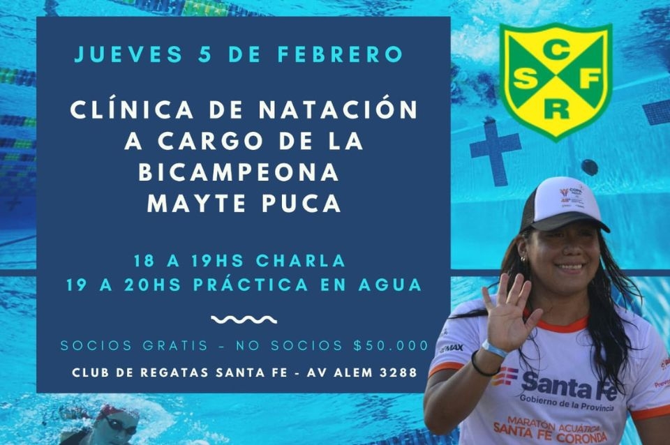 La bicampeona de la Maratón Santa Fe–Coronda, Mayte Puca, compartirá su experiencia y conocimientos en una Clínica de Natación que se llevará a cabo este jueves 5 de febrero en el Club Regatas Santa Fe, ubicado en Avenida Alem 3288.