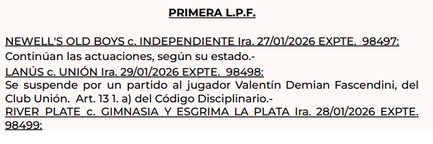 El boletín del Tribunal de Disciplina de la AFA trajo respuestas que en Unión se esperaban con ansiedad. Valentín Fascendini, expulsado ante Lanús, estaba en el centro de la escena y su situación generaba interrogantes pensando en el próximo desafío del Tate.