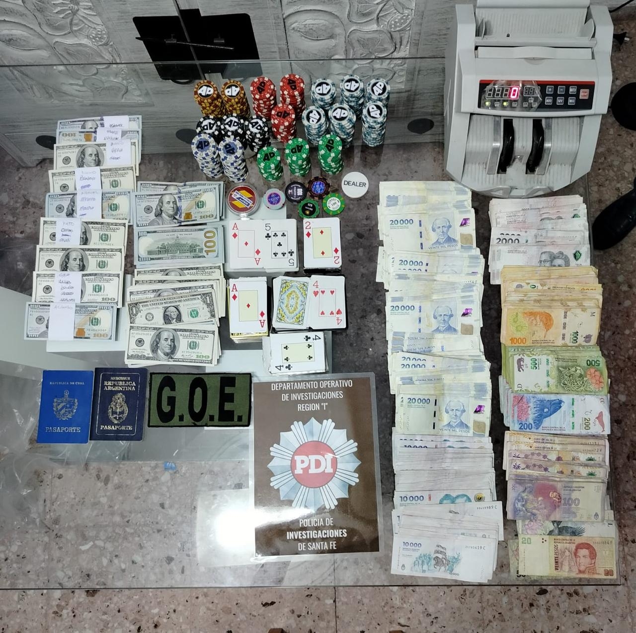 Los efectivos policiales también incautaron dos mesas de póker; la suma de $ 8.362.970 y U$S 5.401; cartelería; 986 fichas de póker discriminadas en colores y valores: azules ($ 500), celestes ($ 1000), rojas ($ 5000), negras ($ 10.000), verdes ($ 20.000), y bordó y amarillo ($ 50.000), por un monto aproximado de $ 4.009.500; y demás elementos de interés para la causa.