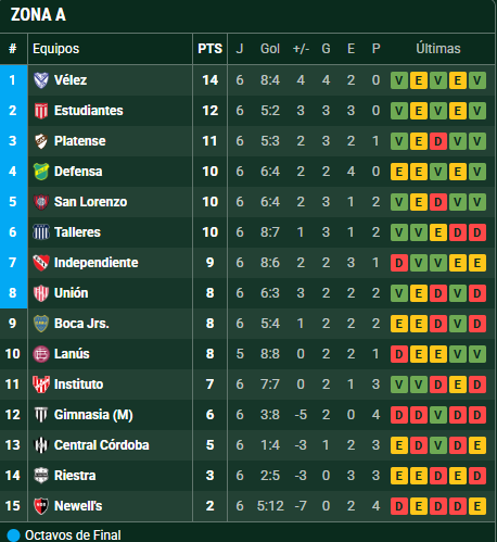 En lo más alto de la Zona A manda Vélez, que se sostiene como líder tras un arranque sólido. En el otro extremo aparece Newell's, que cierra la tabla y busca reaccionar.