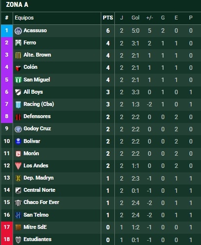 En la cima aparece Acassuso, que ganó sus dos compromisos y suma puntaje ideal. En el otro extremo de la tabla se encuentran Estudiantes de Buenos Aires y Mitre de Santiago del Estero, ambos sin unidades tras las primeras jornadas.