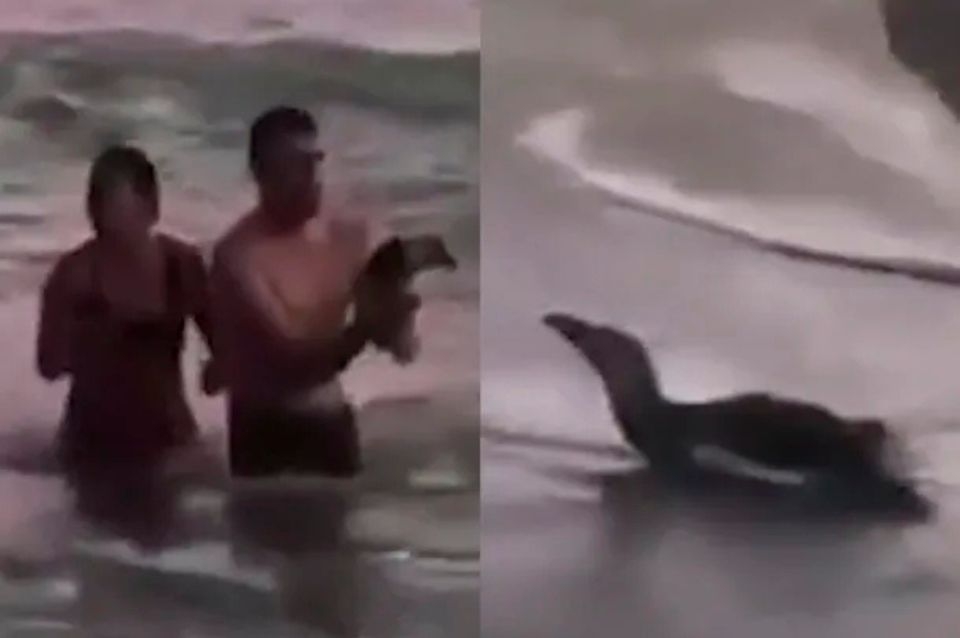 En las imágenes se puede ver al hombre luchando para agarrar al pingüino en el mar mientras era acompañado por su pareja, que se reía de la situación. Luego de unos segundos, lograron llevar a la fuerza al ave a la orilla y lo apoyaron sobre la arena.
