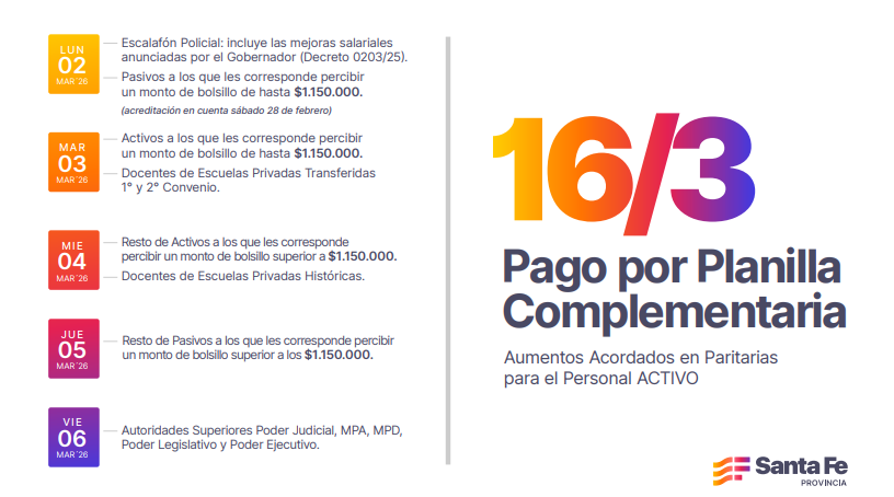Además, confirmaron que el lunes 16 de marzo va a estar disponible el pago complementario correspondiente a la paritaria 2026.