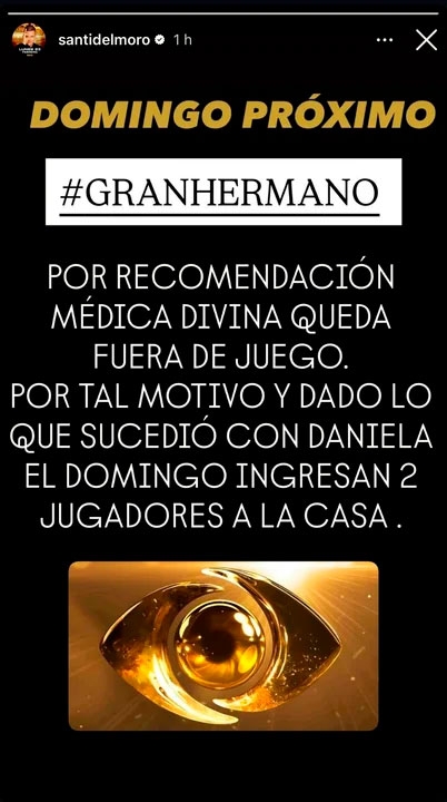 “Por recomendación médica, Divina queda fuera de juego”, escribió el conductor, despejando cualquier especulación sobre un eventual reingreso. En el mismo mensaje, Del Moro adelantó un giro que promete impactar la dinámica de la casa, debido a que este domingo ingresarán dos nuevos jugadores.