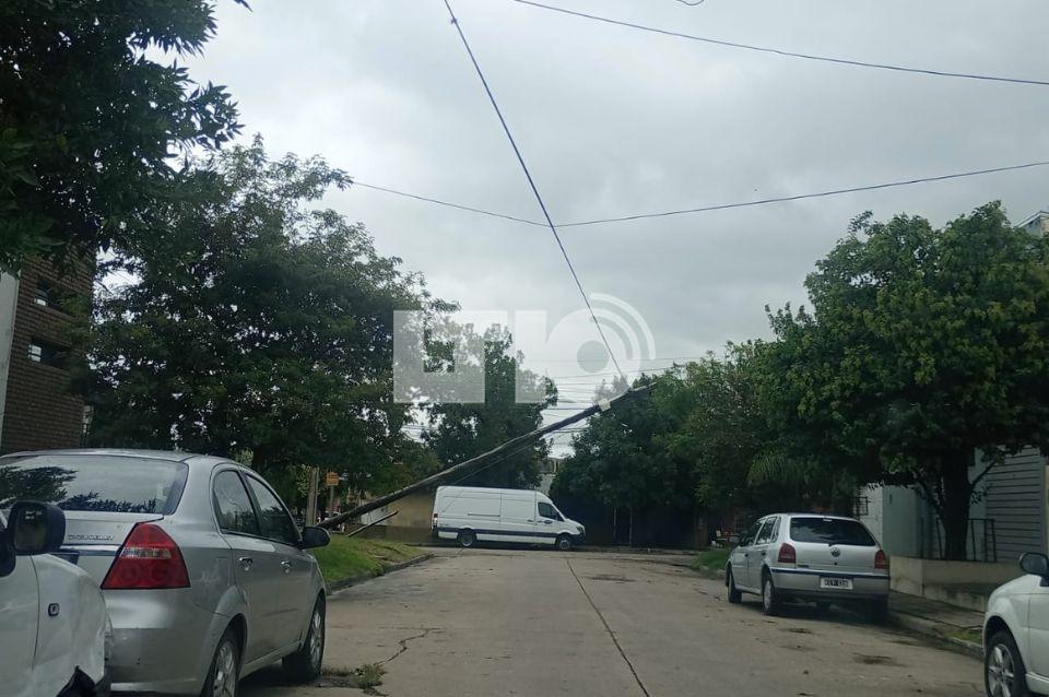 Además, a 50 metros, en calle Lisandro de la Torre al 3800, casi esquina con Santiago de Chile. Allí, un poste de telefonía e internet se desprendió de su base debido a los fuertes vientos y quedó sostenido precariamente por cables ajenos.