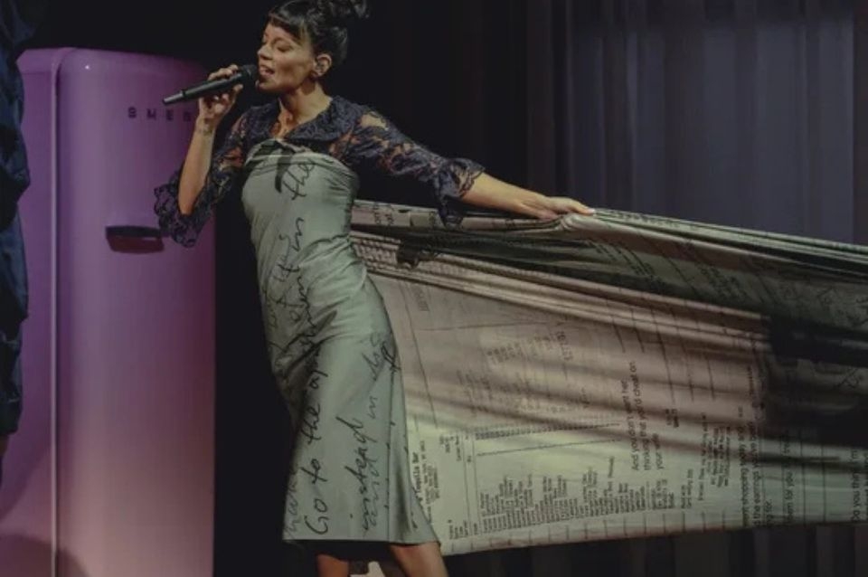 En las imágenes que se viralizaron en redes sociales, se puede ver a Lily envuelta en una tela kilométrica que mezclaba la letra de su canción junto a las impresiones de los recibos reales de bares y tiendas de lujo que Harbour gastó de la cuenta bancaria que compartían.