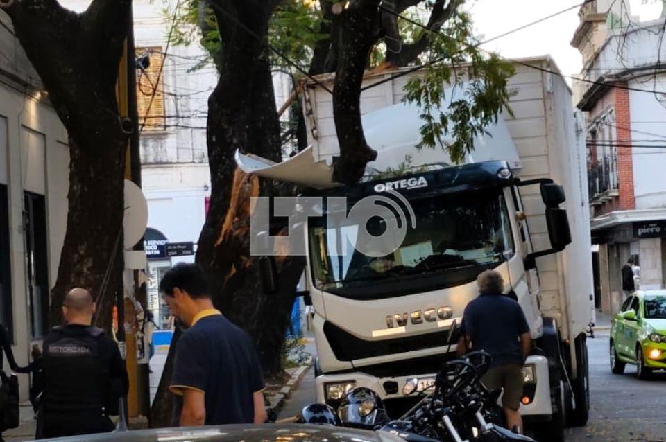 El conductor de un camión sufrió un accidentó que derivó en inconvenientes de tránsito en pleno centro de la ciudad cuando esta mañana, en la intersección de las calles Mendoza y 25 de Mayo, enganchó la rama de un árbol y quedó varado.