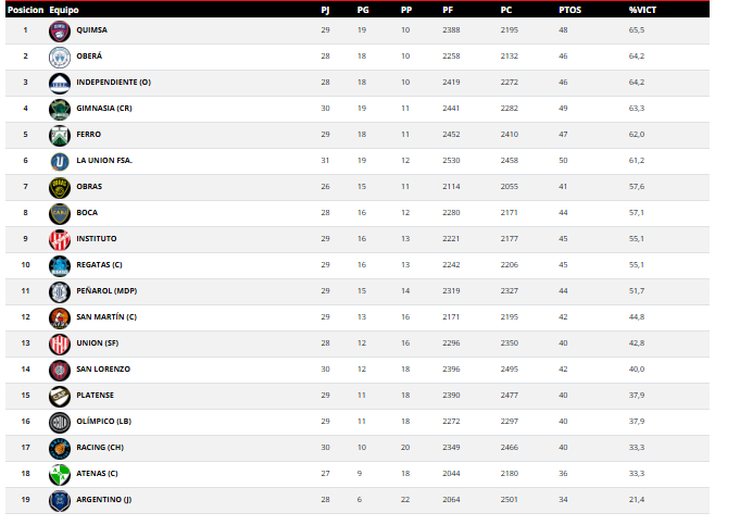 Con este festejo en Junín, Unión se ubica 13° en la tabla con 28 partidos jugados, 12 victorias, 16 derrotas y un porcentaje de 42,8. El dato más importante es que quedó a solo un triunfo de San Martín de Corrientes, que con 13-16 aparece en el 12° puesto, ocupando por ahora el último lugar de clasificación a los playoffs.