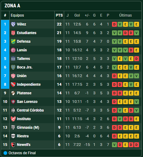 Con 16 puntos en 11 partidos, Unión se ubica séptimo en la Zona A, ocupando por ahora uno de los boletos a los octavos de final. Sin embargo, la tabla está lejos de ofrecer tranquilidad: la diferencia con los equipos que vienen por detrás es escasa y todavía hay rivales con encuentros pendientes.