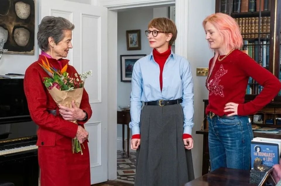 Aquí, el diálogo no revela nada, apenas roza. Los ojos de Rampling, que mantienen su profundidad de siempre, parecerían indagar en vano la realidad de sus hijas, quienes ocultan en vano su incomodidad, por una razón u otra. Hay una distancia que no es hostil sino opaca, el lenguaje no alcanza a tender puentes. El tempo intermedio es engañoso: ni lento ni rápido, sino suspendido. Aquí los motivos retornan con otra entonación, casi irónica, subrayando que la repetición no garantiza comprensión. Como se dijo antes, también hay skaters, un Rolex, el mismo latiguillo sobre el tío Bob, al que Rampling llama “Robert” (un delicado signo de que aquí, al contrario que en los EE.UU., todo es elegante).