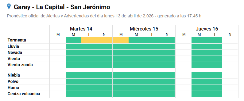 El Servicio Meteorológico Nacional emitió un alerta amarillo por tormentas para el centro y sur provincial. Según el informe, el área, incluido el departamento La Capital, se verá afectado por "lluvias y tormentas de variada intensidad, algunas localmente fuertes".