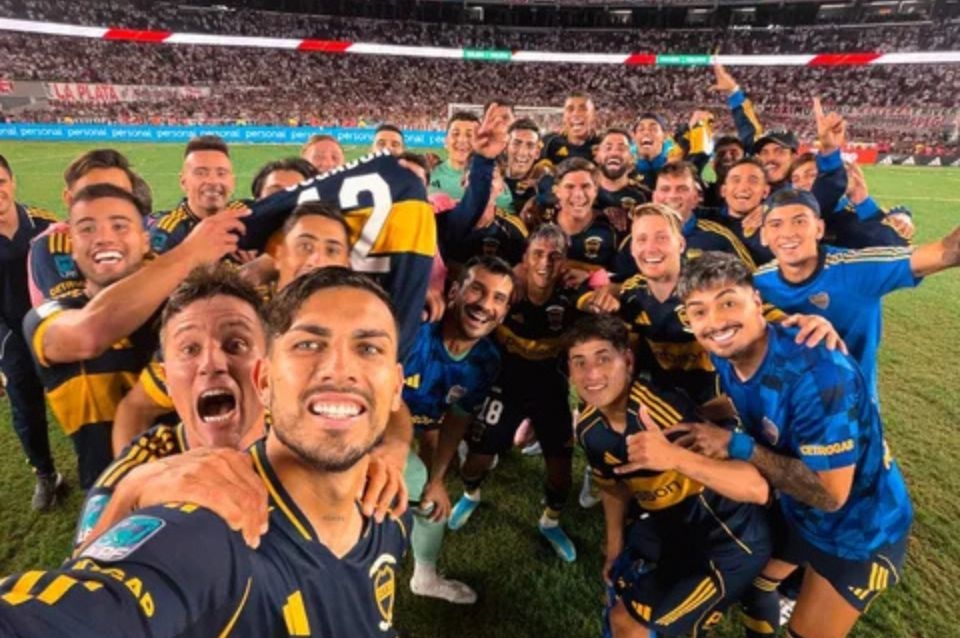 Los jugadores de Boca se reunieron en la mitad de la cancha del estadio Monumental para celebrar, con una serie de selfies, haber conseguido su segundo triunfo consecutivo en el Superclásico del fútbol argentino.