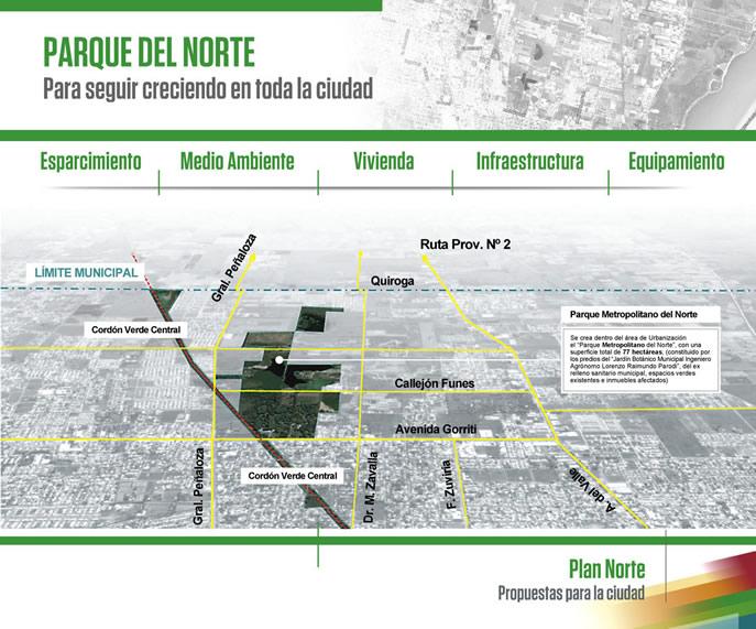 Las políticas tienen por finalidad llevar adelante un proceso de urbanización en los sectores delimitados por las calles General Quiroga al norte, Dr. Zavalla al este, avenida Gorritti al sur y avenida Peñaloza al oeste. Se trata de una superficie total de 227 hectáreas, en las que se contemplan unas 77 para el emplazamiento del Parque del Norte, el corazón del proyecto. El Jardín Botánico, los terrenos de la cava de Borgo y el viejo relleno sanitario, comprenderían al nuevo pulmón paisajístico y ambiental. En este sentido, se proyectan paseos, lagos y espacios deportivos, además de edificios para la educación y la cultura, y la mejora de las instalaciones del Centro de Distrito.