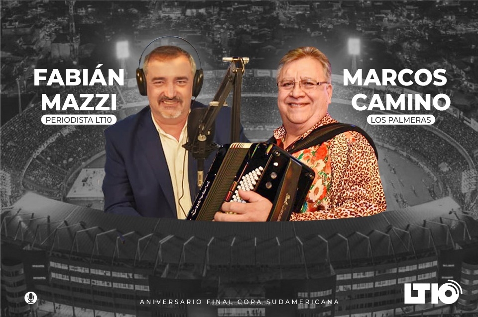 Fabián Mazzi, relator de LT10, y Marcos Camino, integrante de Los Palmeras, recordaron lo que significó estar y tocar en la final de la Copa Sudamericana ante 40 mil personas.